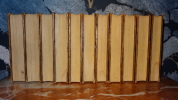 Paris, Vascosan, 1567-1574. 14 vol. in-12, [40]-545 pp. + 546-1170 pp.+ 1171-1784 pp. + 1785-2474 pp. + 2475-3263 pp. + 3264-3932, 150 pp. + [12]-336 ff. + 337-624 ff. + 625-924 ff. + 340 ff. + 341-624 ff. + 625-834-[2] ff. + non paginé + 581-[13] pp., veau blond postérieur, triple filet doré en encadrement sur les plats, dos à nerfs orné de caissons et filets dorés, pièce de titre noir, pièce de tomaison rouge, tranches dorées, plats de vélin d'une reliure antérieure conservée, orné d'un médaillon et de filets dorés( f. Kkkk relié dans le désordre au vol. 6 des Oeuvres mêlée, petits manques aux reliures).