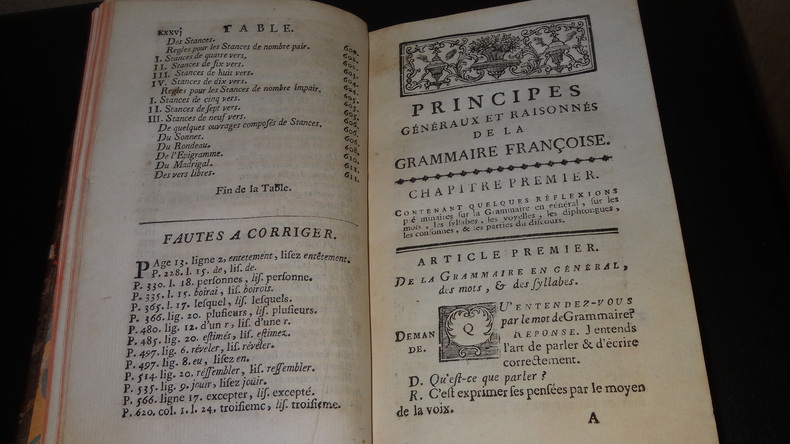 PRINCIPES GÉNÉRAUX ET RAISONNES DE LA GRAMMAIRE FRANCOISE avec des observations sur l'orthographe, les accens, la ponctuation & la prononciation, et un abrégé des règles de la versification Françoise, dédiés à Monsieur le Duc de Chartres Par M.Restaut, Avocat au Parlement & conseil du Roi Plusieurs Ex libris, manuscrits " ce livre n'appartient plus à Farot mais au Moine " + écriture manuscrite. vol in-12, 170x100, reliure pleine basane époque, accrocs, bon état intérieur, bien frais,636pp. Rare exemplaire ! Paris Chez Ph. N. Lottin, J.H Butard MDCCL