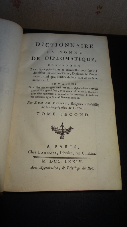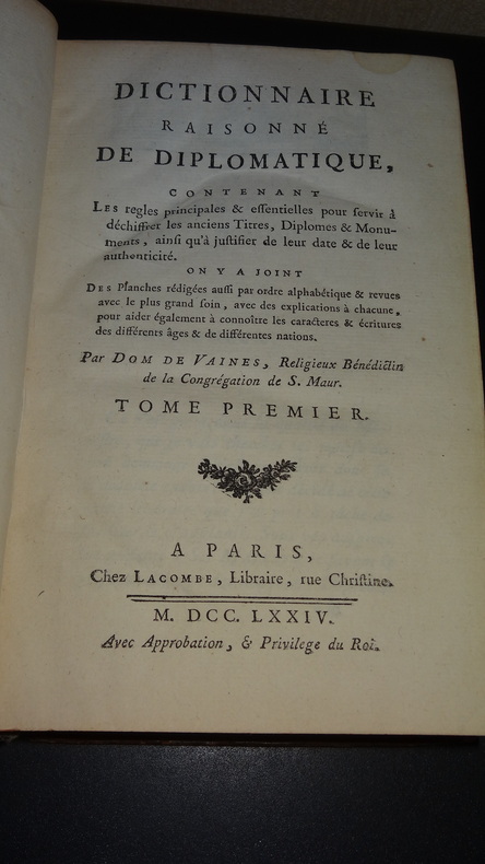 ...Contenant les règles principales & essentielles pour servir à déchiffrer les anciens Titres, Diplomes & Monuments, ainsi qu'à justifier de leur date & de leur authenticité. On y a joint Des Planches rédigées aussi par ordre alphabétique & revues avec le plus grand soin, avec des explications à chacune, pour aider également à connoître les caractères & écritures des différents âges & de différentes nations. À Paris, Chez Lacombe, M. DCC. LXXIV. 2 volumes de format 20,5 x 13,5 cm, reliures plein veau d'époque, dos ornés, tranches rouges, XXIV, 547 + 484 pages, 51 planches hors-texte dont quelques-unes dépliantes, coiffes abîmées avec manques, usures et craquelures au dos, intérieurs collationnés complets, en bon état. Frais de port en supplément.