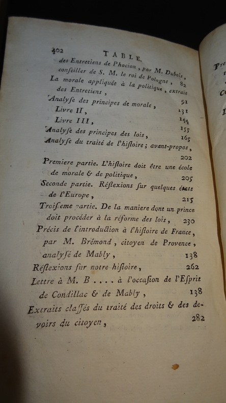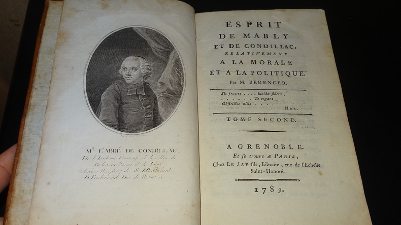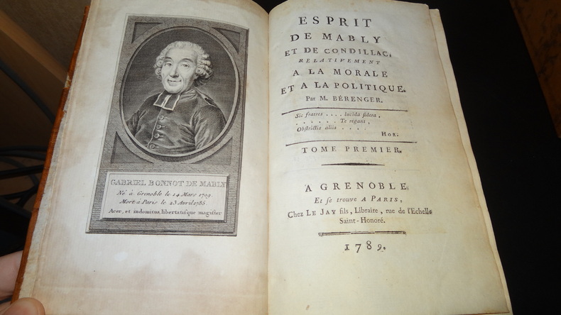 Illustré d'un portrait de Mably et d'un autre de Condillac. Eloge des deux frères, ainsi que des textes sur la propriété des biens, causes des divisions et des inégalités, sur les excès du luxe et la néfaste inégalité des fortunes, etc. Il est à noter que la dédicace de l'ouvrage (à Monsieur de Pastoret) est datée du 14 juillet 1789. INED 401.