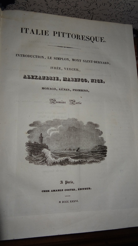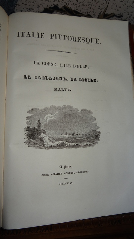 1834 Chez A. Costes éditeur, 1834-36. fort In-4, relié, plats en tissu, dos frotté, , gravure sur le titre, 2 cartes dépliantes, déchirure sur la première carte sur une quinzaine de centimètres, nombreuses gravures n&b hors-texte,environ 134 planches ht, avec mouillures en coin et marges. Deux parties en un fort volume in-4. 1ère partie : Le Simplon, Savoie, Piémont, Gênes : 56 pages. Lombardie: 16 pages. Etat Vénitien, Mantoue, Duché de Parme, Plaisance, Massa, Lucques : 48 pages. Les musées d'Italie, Milan et Venise : 28 pages. Toscane, 48 pages. Voyage Musical en Italie, Académie de France : 24 pages. 2ème partie : Etat romain , Légations de l'état pontifical, Rimini, San Marino, Rome : 128 pages. Campagne de Rome: 8 pages. Naples et conservatoire de Naples : 80 pages. Corse, Ajjaccio, Sardaigne, Sicile, Malte : 64 pages. Calabre, Basilicata, Terre d'Otrante, Pouilles, Abruzzes : 64 pages.