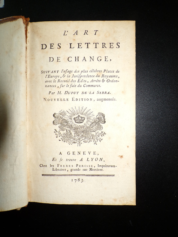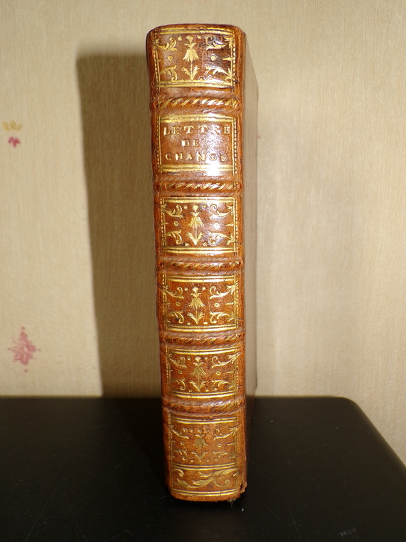 Edition originale rare de cet ''ouvrage trop peu connu. Lorsqu'il écrivait, la science du droit de change n'était pas perfectionnée ; mais il a, plus qu'on ne le pourrait croire, préparé et aidé ce perfectionnement''. (in Camus & Dupin). ''Il ne faut pas seulement considérer la Lettre de change comme un moyen de faciliter les paiements en évitant le transport des espèces, mais encore comme une marchandise, qui, considérée relativement aux rapports du change dans les principales places de l'Europe, produit de grands bénéfices par la circulation, et forme ainsi une branche du commerce très utile''. Camus & Dupin, Bibliothèque choisie des livres de Droit, 1528. Angles élimés. Petit manque superficiel affectant l'angle inférieur du premier plat. Le second présente des frottements. Papier légèrement jauni. Rares rousseurs dans le texte. Du reste, bonne condition.