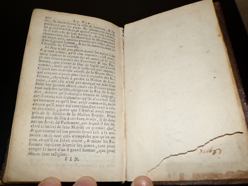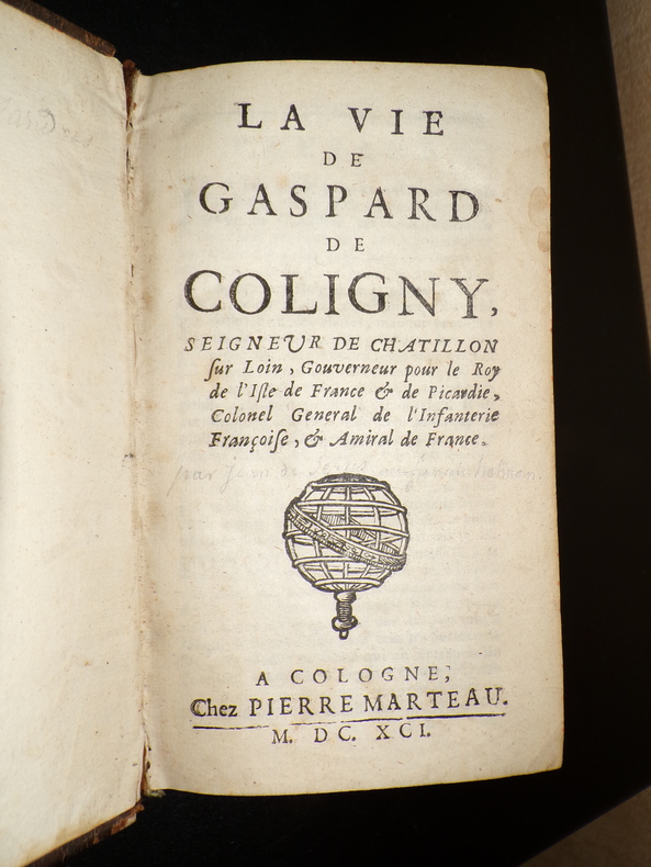 In-12 illustré de la marque de l'éditeur au titre, 8f. (titre et Preface) et 402p. :: Première édition de cette biographie. Barbier t. IV, p 970. Un titre similaire parait en 1643, une traduction du latin qui serait due à François HOTMAN (Barbier, idem). :: Gaspard de Coligny (1519-1572), Seigneur de Châtillon, amiral (1522) de France, chef des protestants, assassiné lors de la Saint Barthélémy à Paris le 24 août 1572. Son père, autre Gaspard de Coligny (1470-1522), était maréchal de France et avait épousé la soeur du connétable de Montmorency. Sa fille Louise (1555-1620) épousa Guillaume le Taciturne, prince d'Orange. Son arrière-petit-fils est le grand Turenne, maréchal de France, un des meilleurs généraux de Louis XIV. :: Reliure de l'époque, veau, dos orné, 5 nerfs. Coins émoussés, coiffe de tête limée, nerfs frottés, mors forcés. Bon exemplaire.