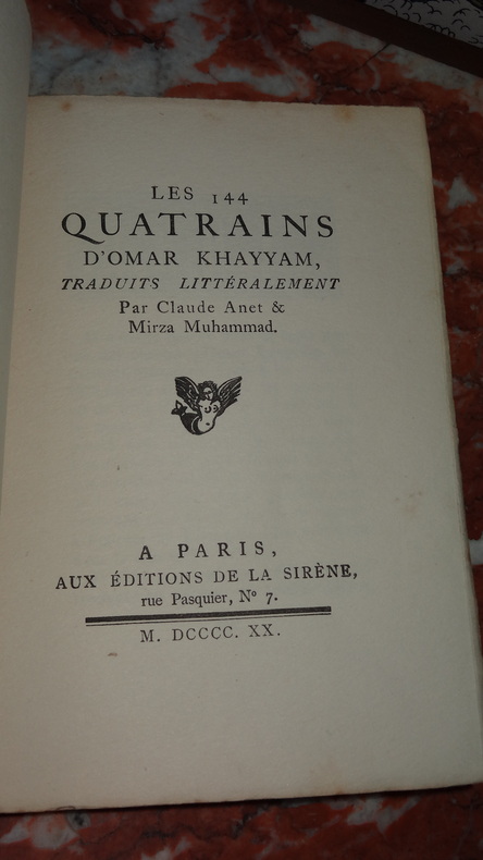 Traduits littéralement par Claude Anet & Mirza Muhammad. À Paris; Aux Éditions de La Sirène, 1 volume broché de format 18 x 12 cm, couverture rempliée, quelques rousseurs éparses, un très petit manque au bas du dos, bon état. Frais de port offerts en lettre suivie pour la France.