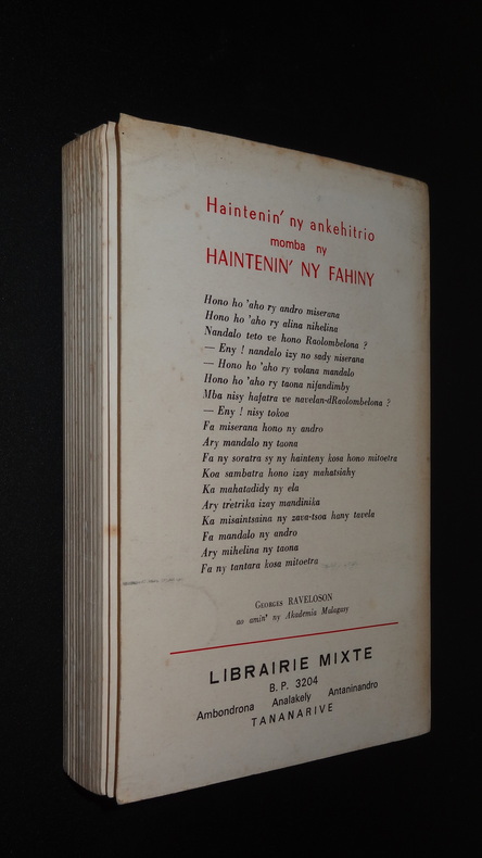Ouvrage publié avec le concours du Centre National de la Recherche Scientifique (France), 1 volume broché de format 19 x 12,5 cm, texte bilingue Malgache/Français, LXIV + 336 pages, prière d'insérer joint, des rousseurs en couverture et sur les tranches, intérieur en très bon état. Frais de port en supplément.