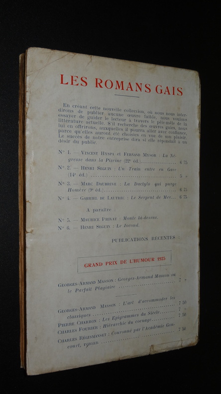 Grand roman d'aventures passionnelles et météorologiques. Paris; Éditions du Siècle, "Les Romans Gais" n°4, mention de 2e édition, 1 volume broché de format 19 x 12,5 cm, couverture illustrée par Alfred Pitron, 200 pages, bon état. Frais de port en supplément.