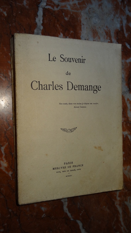 Paris; Mercure de France, 1 volume broché de format 21,5 x 15 cm, 204 pages, 1 composition de Georges Cornélius, 2 portraits de Charles Demange en héliogravure et un autographe, usures en couverture, des rousseurs éparses, état correct. Frais de port en supplément.