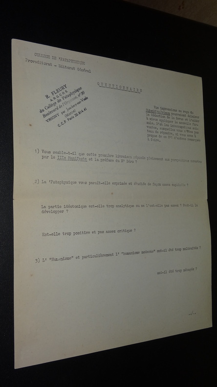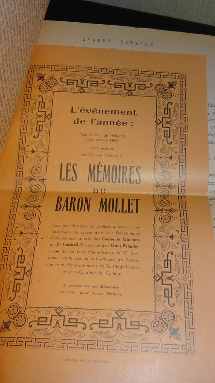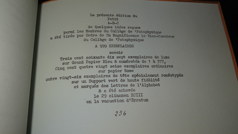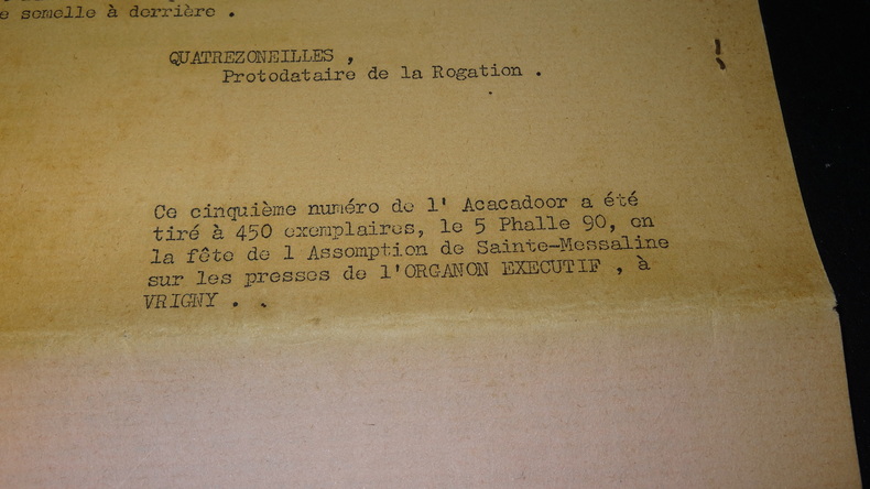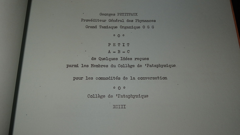 Par Georges Petitfaux. Collège de Pataphysique, tirage à 999 exemplaires, ici l'un des 377 exemplaires de luxe sur grand papier bleu (n°256), 1 fascicule agrafé de format 14 x 21,5 cm, 37 pages, bon état. On joint: le cinquième numéro du Petit Moniteur de l'Acacadoor, 1 questionnaire, un formulaire d'abonnement, l'enveloppe ayant servi à l'expédition du tout, bon état. Frais de port en supplément.