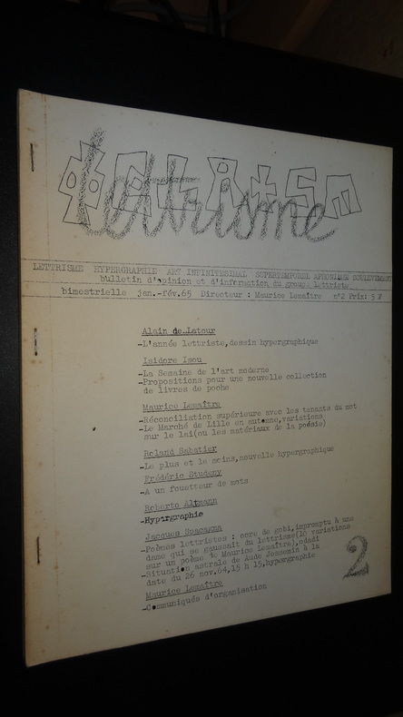 Lettrisme, Hypergraphie, Art infinitésimal, Supertemporel, Aphonisme, Soulèvement. Bulletin d'opinion et d'information du groupe lettriste, sous la direction de Maurice Lemaître, 1 ouvrage agrafé ronéotypé de format 27 x 21 cm, 36 pages, bon état. Frais de port offert en lettre suivie pour la France.