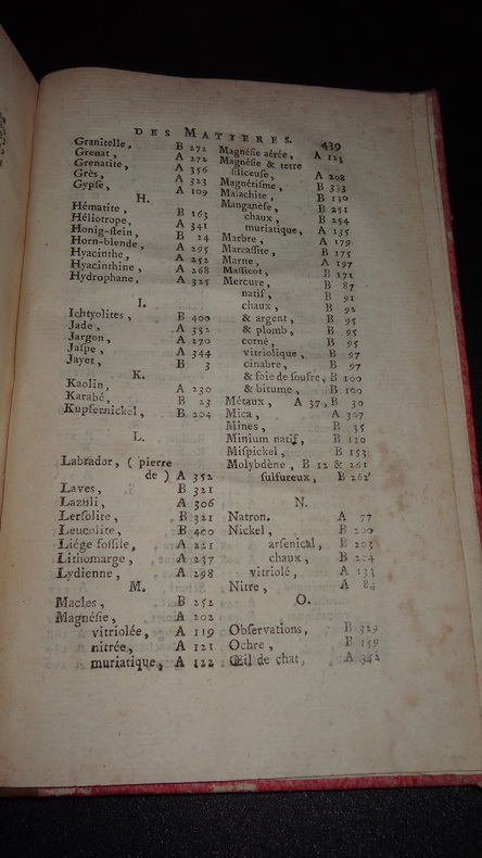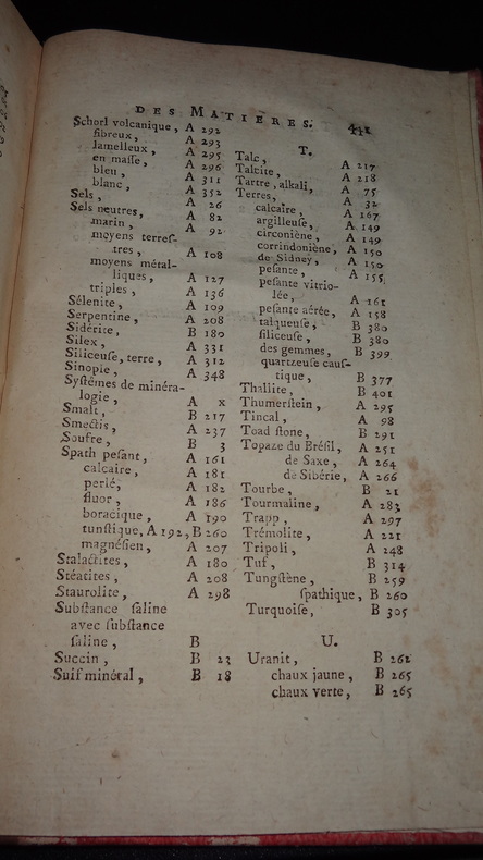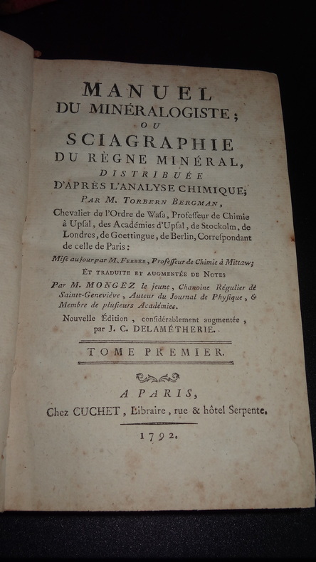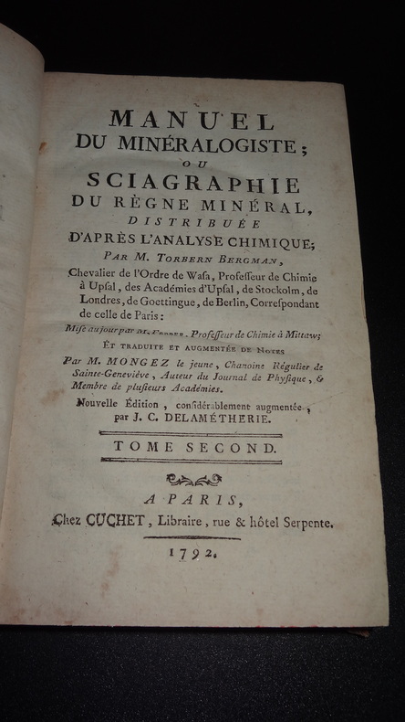 Paris, Cuchet, 1784. In-8°(LXXXVIII. 343 pp.), reliure demi-veau. Première édition française de la "Sciagraphia Regni Minerali" du chimiste suédois Torbern Bergman (1735-1784), l' un des ouvrages les plus importants de l'époque sur le classement chimique des minéraux. 1 planche hors-texte.