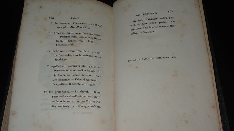 Paris, Gosselin, 1832, in-12, 2 tomes en 1 vol, [8]-145 pp, [6]-163 pp, Demi-maroquin bleu, dos à faux nerfs orné de fleurons, tranches peigne, Seconde édition. La première, au format in-8, avait été publiée la même année et tirée à 25 exemplaires seulement. L'ouvrage rend hommage au mime du théâtre des Funambules Jean-Gaspard Deburau (Jan Ka?par Dvo?ák, 1796-1846). Chaque tome ouvre sur un frontispice et un titre, gravés sur bois par Porret et Cherrier. Le texte est illustré de deux lettrines, au début de chaque tome, et d'une vignette et d'un cul-de-lampe final. Les pages 3-4 et 13-14 du tome II sont décrites comme des cartons par Asselineau : - Le premier comporte la lettrine de Pierrot qui étrangle Arlequin. - Le second porte le fac-similé de la signature de Deburau. Étiquette ex-libris "R.N." Larges brunissures en tête du tome II. Dos insolé, coins inférieurs usés. Asselineau, Bibliographie romantique, p. 36-37. Vicaire IV, 525-526. Couverture rigide