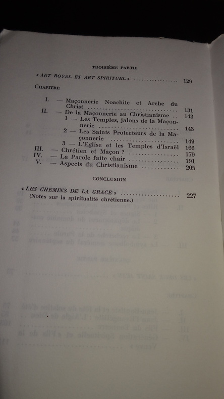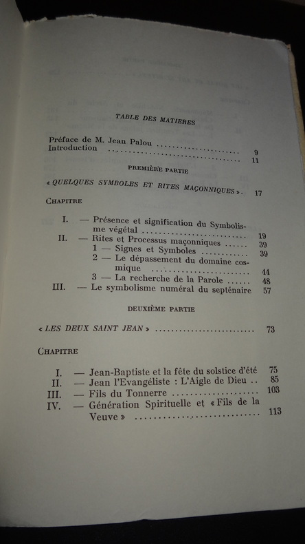 1 pkanche en frontispice nouvelle édition revue et augmentée, 1993 Contents, Chapitres : Introduction à la seconde édition, préface de Jean Palou - De quelques symboles et rites maçonniques - Les deux Saint Jean - Art royal et art spirituel - Conclusion - Les chemins de la grâce couverture à peine jaunie avec de légères traces de pliures, sinon bon état, intérieur propre, papier à peine jauni, cela reste un bon exemplaire