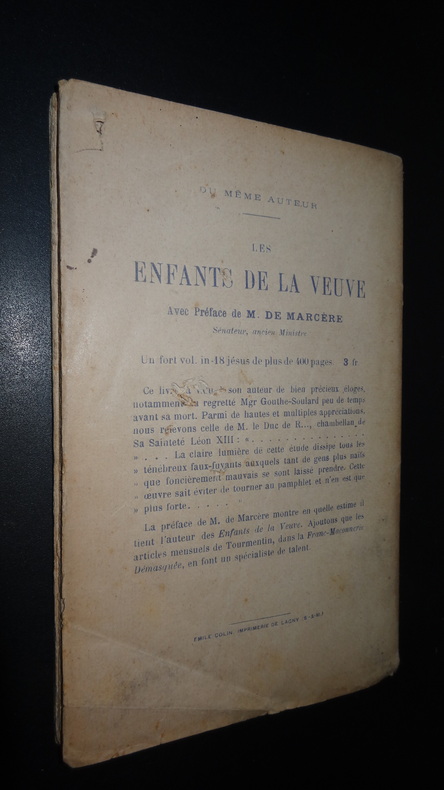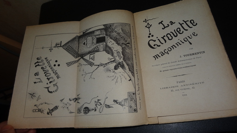 Paris Librairie antisémite 1901 in 12 (19x12) 1 volume broché, frontispice dépliant, IX et 88 pages. Avec un curieux dessin de l'auteur (frontispice) et quinze reproductions authentiques. Tourmentin J., Secrétaire général du Comité Antimaçonnique de Paris. Notre exemplaire porte sur le faux-titre: l'ex-libris manuscrit du Vicomte Amaury de Chansiergues d'Ornano, Avignon Hotel de Chansiergues. Très bel exemplaire ( Photographies sur demande / We can send pictures of this book on simple request )