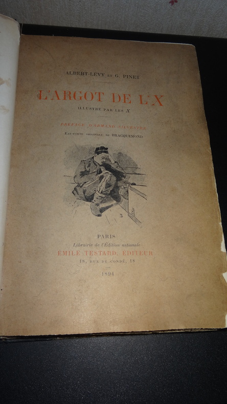L'argot de l'X, illustré par les X. Préface d'Armand Silvestre. Eau-forte originale de Bracquemond. (Paris: Emile Testard, 1894). [M.C.: Ecole Polytechnique, argot, linguistique]