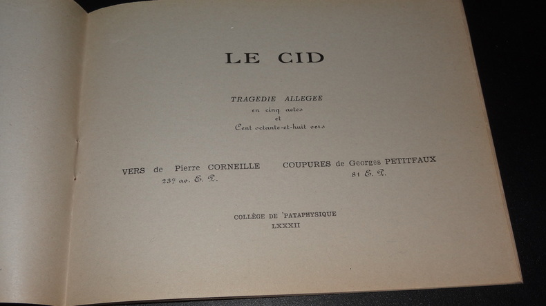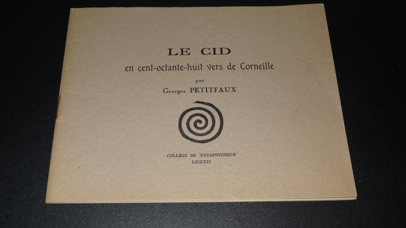 Collège de 'Pataphysique, coll. "Haha", LXXXII (2 juillet 1955), in-12 oblong, broché, 30 p. Edition originale tirée à 555 exemplaires, celui-ci numéroté sur papier authentiquement Gris-Hildalgo.