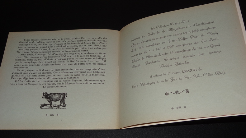 Traduction de Pierre Bure-Jouët - Paris : Collège de Pataphysique (Coll. "Le traître mot" N°4), 14 juillet 1959 - volume 12x13,5 cm sous couverture illustrée en deux tons, 40 pages sur papier vert illustrées en noir - Tirage à 555 exemplaires - bon état -