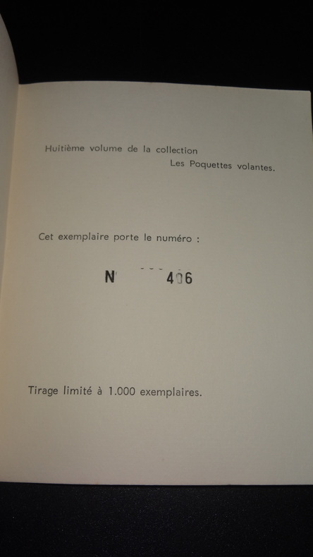 La Louvière (Belgique); Daily-Bul, collection "Les Poquettes Volantes" n°8, tirage à 1000 exemplaires (n°406), 1 volume agrafé de format 13,5 x 11 cm, non paginé, légère décoloration au dos, bon état. Frais de port en supplément.