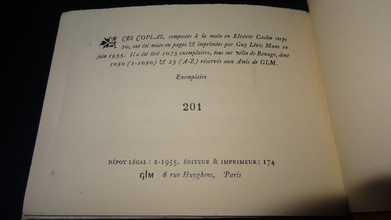 Éditions GLM, tirage limité à 1075 exemplaires sur vélin de Rénage (n°201), 1 volume broché de format 10,5 x 13,5 cm, 38 pages, légères traces anciennes de ruban adhésif sur les gardes, bon état. Frais de port offerts en lettre suivie pour la France.