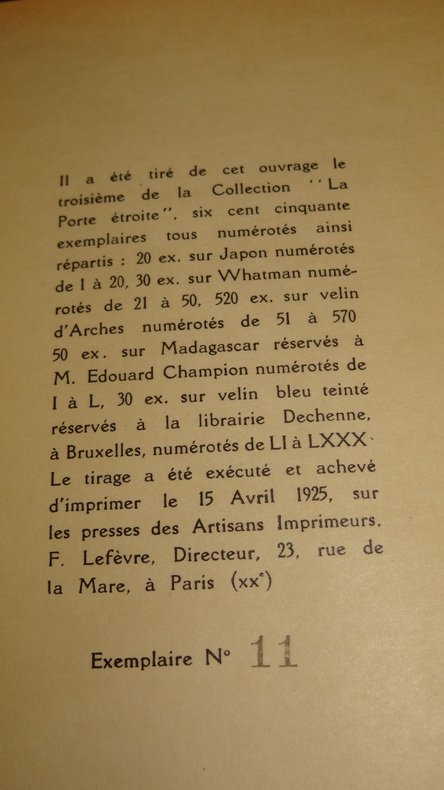 Paris; À l'Enseigne de la Porte Étroite, ici l'un des 20 exemplaires sur Japon (n°11), 1 volume broché de format 16,5 x 11,5 cm, couverture rempliée, 57 pages, très bon état. Frais de port offerts en lettre suivie pour la France.