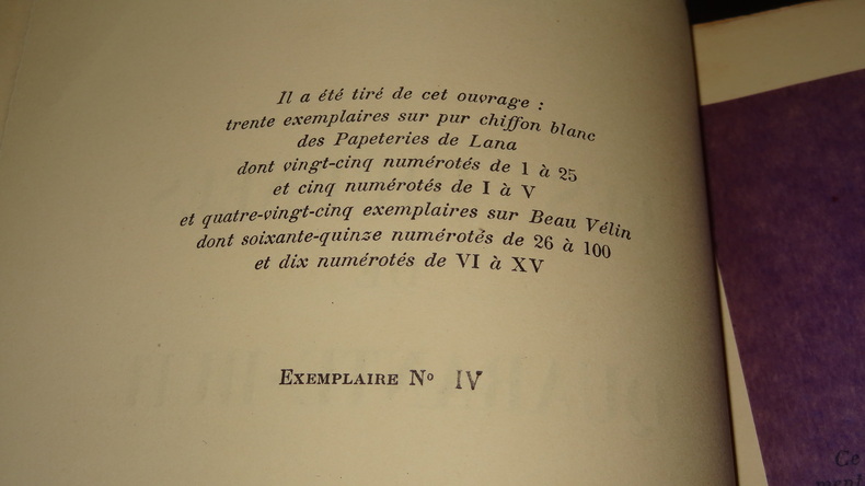 Éditions Flammarion, tirage à 115 exemplaires numérotés, ici l'un des 30 sur pur chiffon blanc des papeteries de Lana (n°V), 1 volume broché de format 23 x 16,5 cm, grand de marges, 295 pages, zones brunies en couverture, petites déchirures marginales sur les marges, intérieur en très bon état, non coupé. Frais de port en supplément.