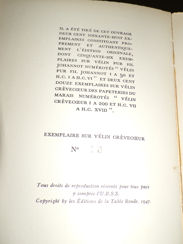 Éditions de la Table Ronde, tirage à 268 exemplaires numérotés, ici l'un des 212 sur vélin crèvecœur (n°58), 1 volume broché sous couverture rempliée, avec en frontispice une eau-forte originale de François Salvat, petits plis de lecture au dos, petites taches en couverture, intérieur en très bon état. Frais de port en supplément.