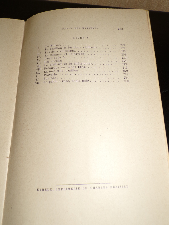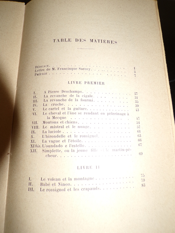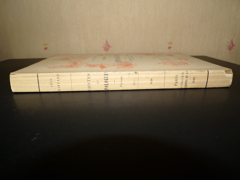 Un volume grand in-8°, reliure rigide éditeur, couverte de soie à petits motifs rouges et blancs (ce qui produit une sorte de fond rose), dos lisse et muet, 1er plat orné d’un dessin de F. Régamey (silhouettes dorées de deux animaux provoquant un envol d’oiseau x) encadré par les mentions du nom de l’auteur et de l’illustrateur). L’ouvrage comprend 251 pages , soit 60 contes et apologues, illustrés par d’abondants in et hors-texte, la plupart du temps en couleurs, dessinés et peints par Frédéric REGAMEY, frère de Félix REGAMEY (qui fut un des premiers peintres du JAPON). Frédéric fut un grand peintre, illustrateur et créateur de journaux de son temps (PARIS A L’EAU FORTE, LE QUOTIDIEN ILLUSTRÉ ETC..) Il est connu de surcroît pour avoir inventé la Chromolitographie . Dans ces CONTES ET APOLOGUES, il écrit en réalité des fables. Et le Préfacier Henri CHANTAVOINE écrit très justement les mots suivants: “Les vrais moralistes, et M. Riffard est de ceux-là, ne sont ni des blasés que le monde ennuie et qui cherchent à en dégouter les autres; ni des sceptiques qui doutent de tout, excepté d’eux-mêmes, ni des habiles qui savent le Jeu et travaillent à en retirer leur épingle,; ni enfin des naïfs qui s’enrouent à prcher dans le désert, par amour de la prédication. Ce sont d’honnêtes gens qui essaient bonnement de se rendre utiles par leurs actes et par leurs paroles, par leurs exemples et par leurs préceptes. C’est en cela que les fables sont un excellent cours de morale pratique, le plus agréable et le plus instructif que nous sachions”. La reliure est signée d’un grand relieur: Antoine LENEGRE . Exemplaire présentant quelques petites taches sur le premier plat mais globalement en BON ETAT.