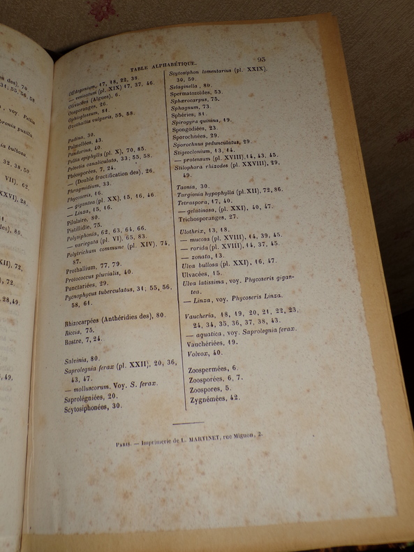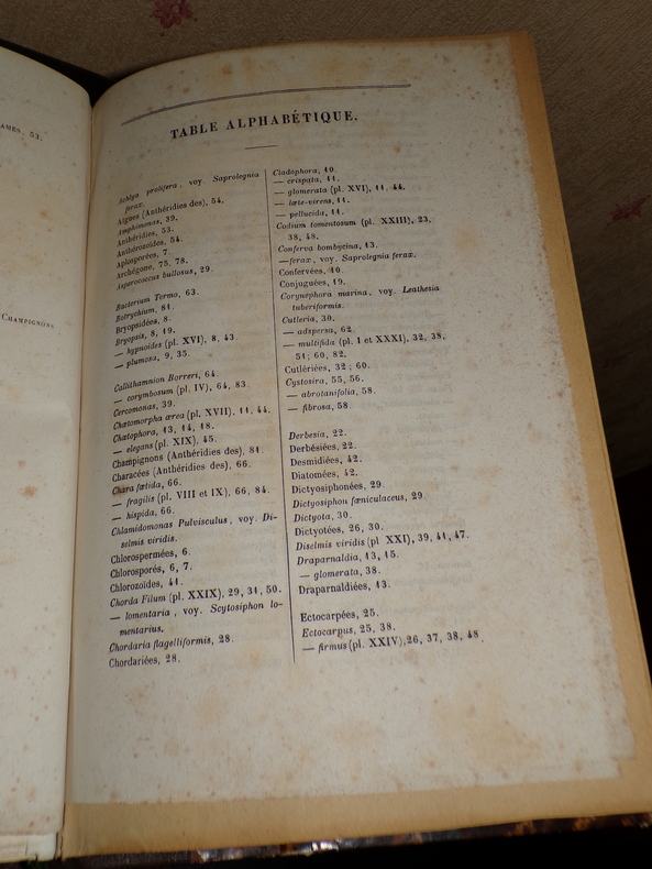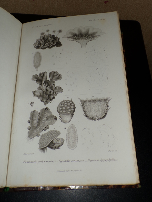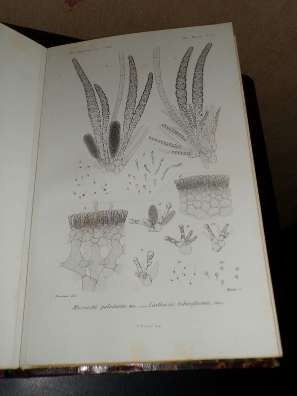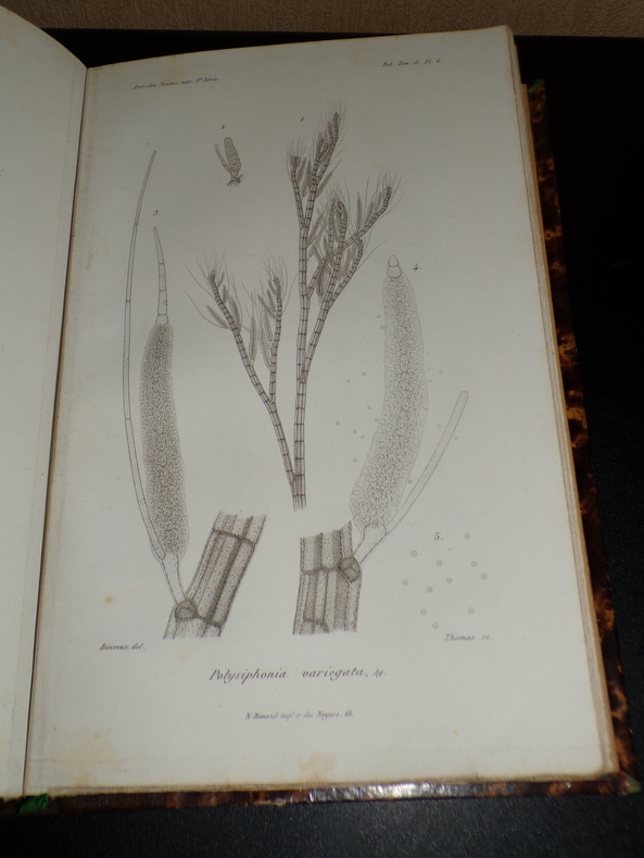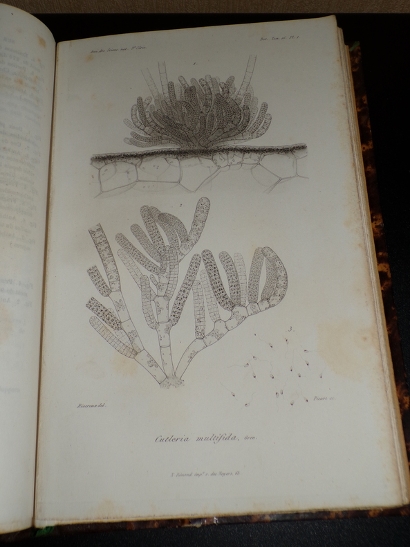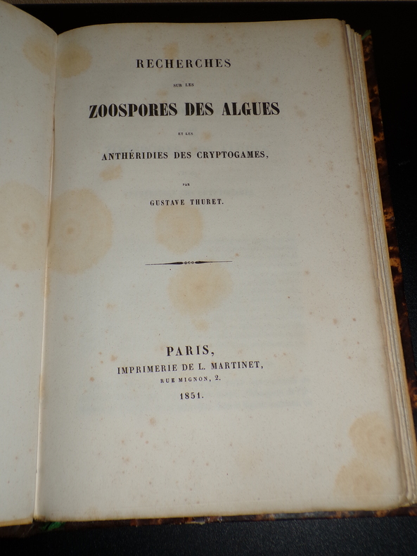 Par Gustave Thuret. Paris; Imprimerie de L. Martinet, 1 volume de format 26 x 17,5 cm, reliure demi chagrin, 93 pages de texte et 31 planches hors-texte, il est joint un fascicule de 8 pages: "Note sur les zoospores des algues olivacées", reliée en début d'ouvrage, quelques rousseurs éparses, bon état. Frais de port inclus en colissimo pour la France.