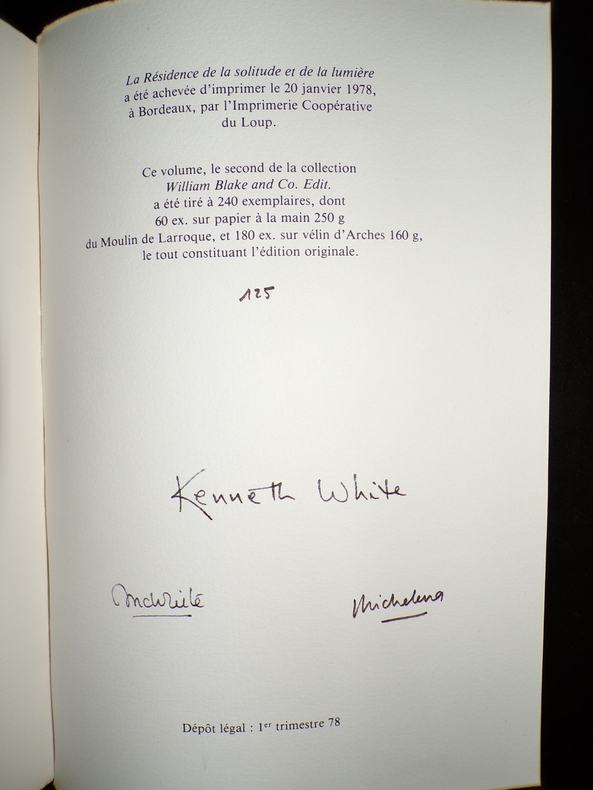 LA RÉSIDENCE DE LA SOLITUDE ET DE LA LUMIÈRE Méditations Pyrénéennes 1 Kenneth Whyte Texte original et traduction broché, 270x185, bon état int. 28pp, tirage à 240 ex. William Blacke and Co achevé d'imp. 20 janvier 1978 ref/c12/4