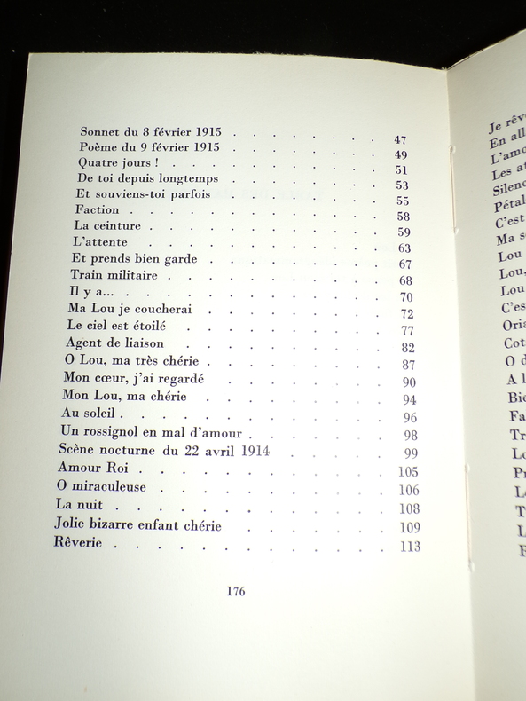 Genève Pierre Cailler 1947. 145 pp. In-12. Broché. État correct. 1 volume. Collection "Beaux textes, textes rares, textes inédits". 11ème de la collection."Un peu avant d'être envoyé au front, après un engagement volontaire, Guillaume Apollinaire rencontre Lou. C'est la passion, la tornade, l'amour plus que fou ! Cette passion sera loin de n'être que sentimentale. Elle atteindra aussi des sommets charnels qui obséderont le poète abandonné dans ses tranchées parmi la troupe, les obus sifflants au-dessus de sa tête et la morts marquant ses journées. L'absence de l'être aimé ne fait qu'en attiser le besoin et son idéalisation. Apollinaire est plus que malheureux, coupé de cette femme qu'il ressent comme lui étant aussi nécessaire que l'oxygène qu'il respire. Sa passion va prendre une allure absolue, totale, obsédante!Malheureusement, Lou n'est pas Pénélope, loin s'en faut ! Elle aime, oui, mais elle des difficultés à concevoir un lit autrement que garni et l'absent a bien tort...Sa fidélité sera donc toute relative, comme son empressement à répondre aux missives enflammées de notre Guillaume. Il ne pourra qu'en souffrir davantage et l'amoureux qui souffre aime bien souvent plus follement encore.Ces poèmes dédiés à Lou sont l'expression de ses sentiments et de ses obsessions charnelles, mais aussi une description de ce qu'il voit et de ce qui l'entoure. La présence quotidienne de la mort et de l'invalidité ne pouvait qu'attiser ses passions. Ce recueil est superbe !"ÉDITION ORIGINALE LIMITÉE à 3420 exemplaires numérotés. Celui-ci est un des 3000 exemplaires numérotés sur papier chamois.
