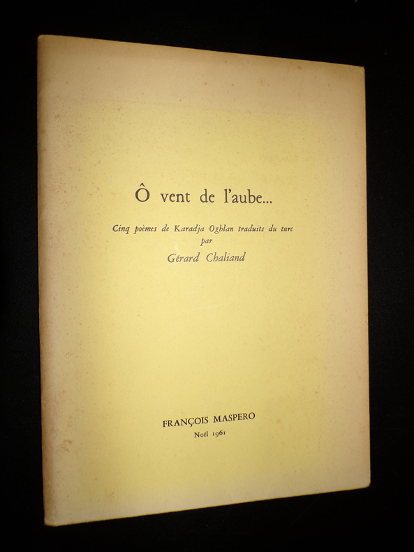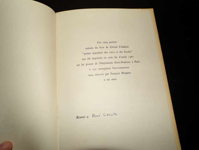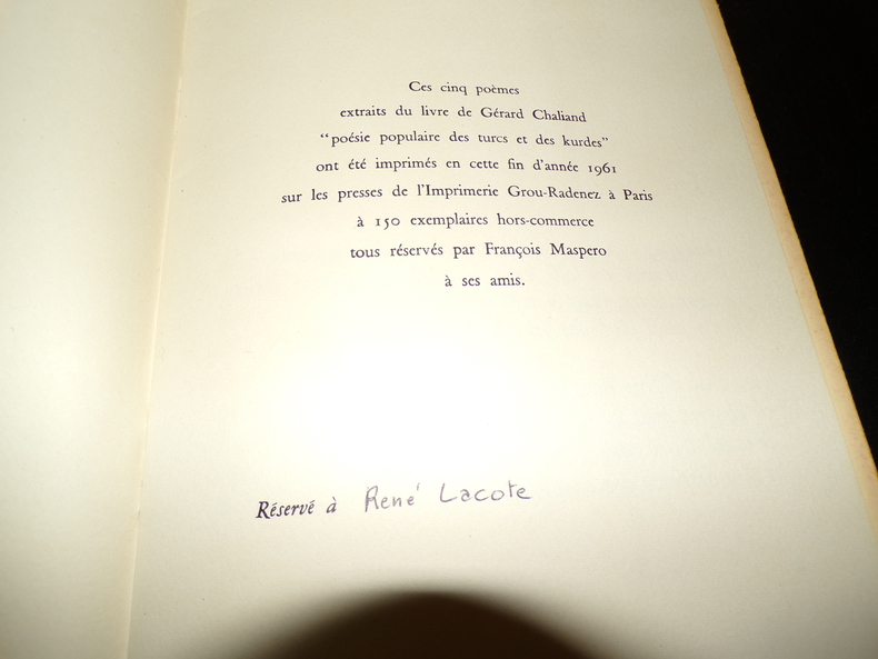 Éditions François Maspero, tirage à 150 exemplaires réservés aux amis de François Maspero (exemplaire de René Lacote), 1 plaquette agrafée sous couverure rempliée, 13 pages, décolorations en couverture, intérieur en bon état, avec quelques rousseurs. Frais de port en supplément.