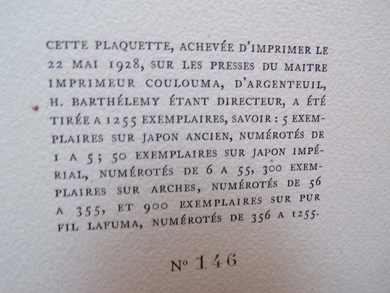 Paris Editions Emile-Paul Frères 1928, in-8, in-8,broché sous couverture rempliée, 14p. Frontispice de Hermine David. Un des 300 ex. sur Arches, après 5 ex. sur japon ancien, 50 ex. sur japon impérial, suivent 900 ex. sur pur fil Lafuma. Bel état.