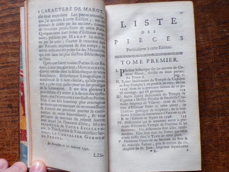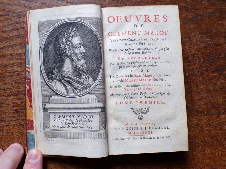 Œuvres de Clement Marot valet de chambre de François I, Roy de France, revûes sur plusieurs manuscrits, & sur plus de quarante éditions; et augmentées tant de diverses poësies véritables, que de celles qu'on lui a faussement attribuées, avec les ouvrages de Jean Marot, son père, ceux de Michel Marot, son fils, & les pièces du different de Clement avec François Sagon: accompagnées d'une préface historique & d'observations critiques. A La Haye, Chez P. Gosse & J. Neaulme, M. DCC. XXXI. 6 volumes de format 15 x 9 cm, reliures plein veau d'époque, dos ornés, tranches rouges, XXIV, 408 + ,XVI? 428 + XXIV, 389 + VIII, 387 + XXIV, 392 + VIII, 374 pages, coins frottés, coiffes abîmées avec petits manques, mors fendus sur la plupart des tomes, intérieurs en bon état. Frais de port en supplément.