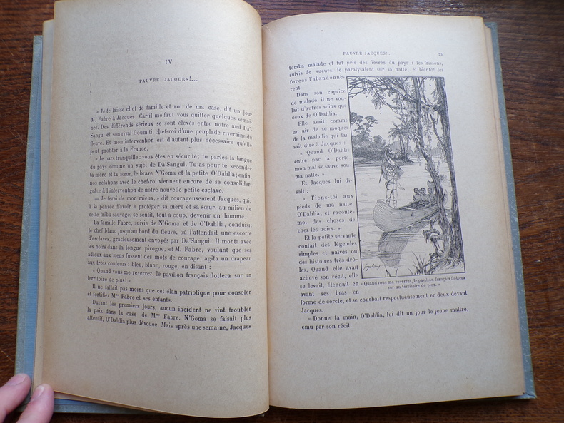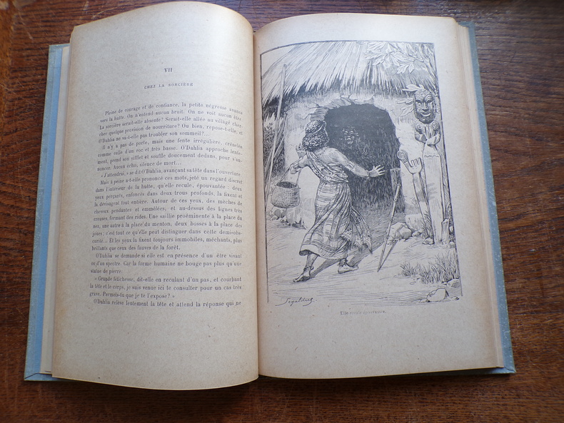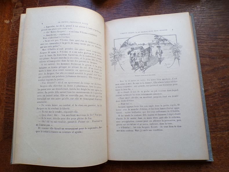 Un volume petit in-4°, reliure percaline grise éditeur avec un 1er plat illustré en or et rehaussé par des dorures (il s’agit d’une des scènes du roman montrant la jeune princesse se défendant contre des caïmans agressifs). La tranche supérieure est dorée. L’ouvrage compte 121 pages + une Table.L’action est située au CONGO français. L’héroïne de l’histoire est une jeune esclave noire qui a des sympathies pour la France. RELIURE EDITEUR, exemplaire en TRES BON ETAT.