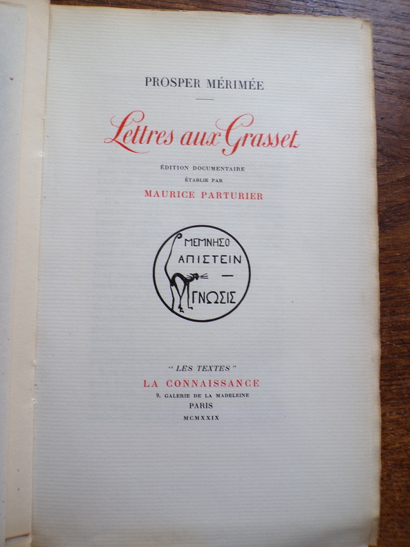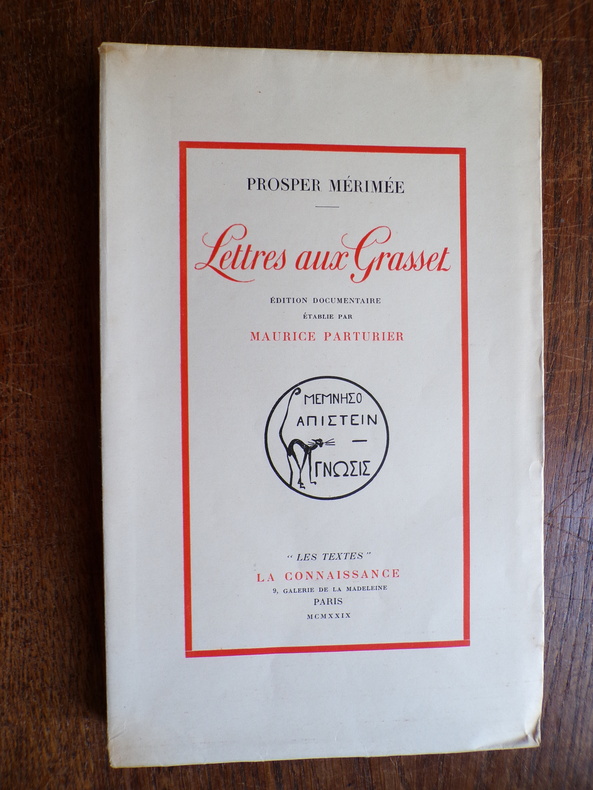 La Connaissance 15 x 23 Couverture rigide Paris Ed. originale 1929 Volume in-8, reliure demi-veau rouge, dos à cinq nerfs, titre doré, 218 p., portrait de l'auteur en frontispice gravé sur bois par J. Lemoine, un des 700 exemplaires numérotés sur Alfa impondérable, exemplaire n°477, 8 reproductions hors texte du portrait d'Edouard Grasset et de fac-similés d'autographes. Edition originale. Notre exemplaire comprend, relié en tête, une lettre autographe du docteur Maurice Parturier en date du 24 avril 1961 et son enveloppe, à Alain Goldie, Torrelavega en Espagne. Exemplaire en très bon état.(BB15) Livre