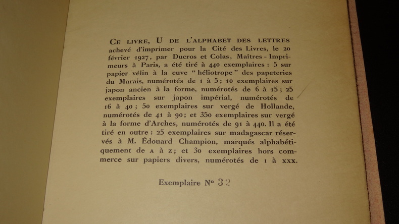 Paris; A la Cité des Livres, U de l'Alphabet des Lettres, tirage à 440 exemplaires numérotés, ici l'un des 25 sur japon impérial (n°32), 1 volume broché de format 16,5 x 13 cm, couverture rempliée, 93 pages, très bon état. Frais de port en supplément.