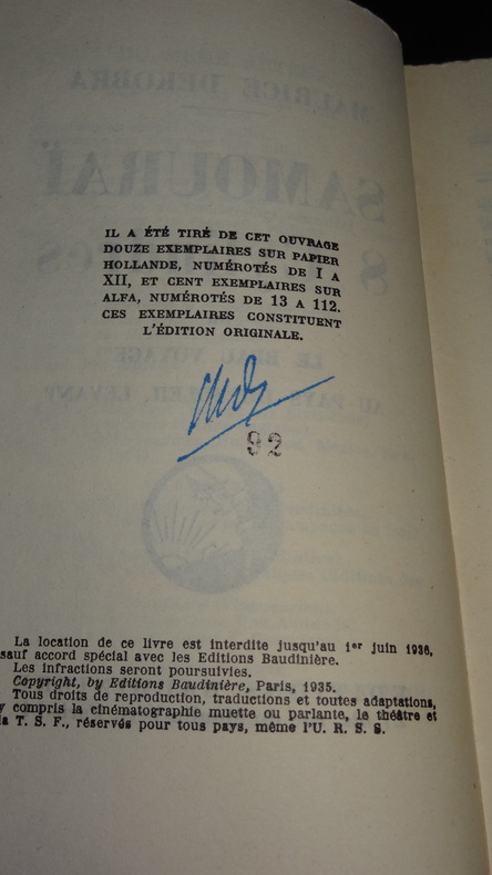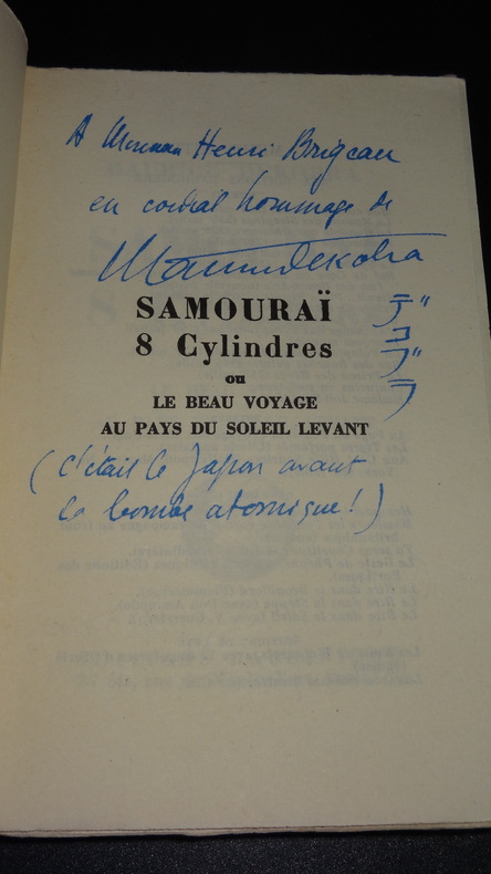 Ou Le beau voyage au Pays du Soleil Levant. Éditions Baudinière, tirage à 112 exemplaires numérotés, ici l'un des 100 sur alfa (n°92), 1 volume broché de format 19 x 12 cm, 238 pages, envoi manuscrit de l'Auteur en page de faux-titre, petit déchirure sans manque au plat arrière, bon état. Frais de port en supplément.