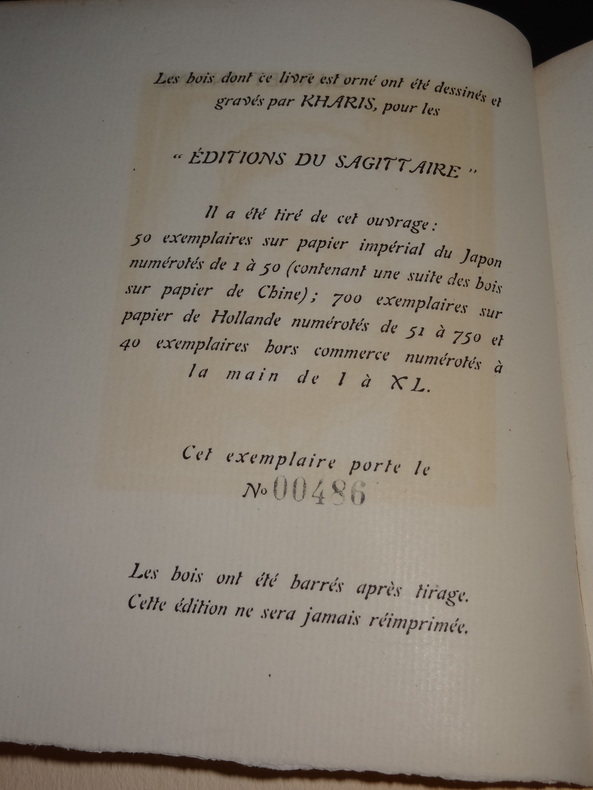 Edition Originale. Tirage unique à 790 exemplaires. Un des 700 exemplaires sur papier de Hollande (N°0489). Bois dessinés et gravés par Kharis. PHOTOS sur DEMANDE. ...................... Photos sur demande ..........................
