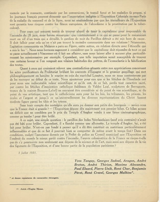 Ce second tract réagit - de manière complexe - à l'incendie qui vient d'avoir lieu dans le Pavillon des Indes néerlandaises de l'Exposition coloniale. Ravis de voir tomber l'une des pièces capitales de cette « démonstration impérialiste », ils déplorent la perte des objets d'art primitif qu'il contenait, non seulement pour leur valeur propre, mais parce qu'en faisant l'objet d'études anthropologiques, par exemple, ils pouvaient servir indirectement les mouvements de lutte contre le colonialisme. Le tract est signé des 12 surréalistes du groupe et de 12 «signatures de camarades étrangers» mentionnées sans détail.