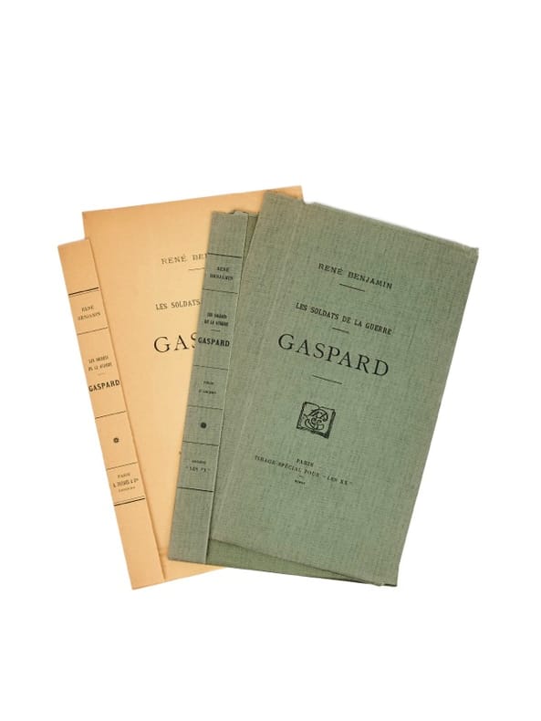 Prix Goncourt en 1915, Gaspard constitue l'un des premiers témoignages littéraires écrits sur la Grande Guerre. Le 31 octobre 1914, les membres de l'Académie Goncourt se réunissent pour la première fois au restaurant Drouant, place Gaillon. L'issue de la guerre reste très incertaine et, dans ces conditions, les académiciens décident de ne pas décerner leur prix, et projettent alors d'en attribuer deux l'année suivante. La double attribution n'aura finalement lieu qu'en 1916 et, en décembre 1915, « afin de permettre aux jeunes auteurs qui avaient des romans sous presse ou en lecture au début de la guerre de prendre part au concours», c'est donc un seul prix qui est décerné. Il est attribué, pour la première fois depuis la création du Goncourt en 1903, à l'unanimité, et vient couronner Gaspard de René Benjamin. Mobilisé au début du conflit - à l'âge de 29 ans -, l'auteur livre ici une chronique de la vie de caserne et de front, à travers le personnage de Gaspard, un parigot hâbleur, gouailleur et débrouillard, censé être l'incarnation du poilu français. À la différence d'autres publications plus sombres, Gaspard se distingue par un ton allègre et satirique, donnant à lire les absurdités de la hiérarchie militaire. Parmi les douzaines d'ouvrages parus dès 1915 ayant pour thème le conflit naissant, Gaspard est surtout le premier et seul véritable roman : l'oeuvre eut un grand succès à sa parution et, renforcée du prix Goncourt, atteint très vite la centième édition. Selon Norton Cru, Gaspard fut le livre favori « d'un public maintenu dans l'ignorance de la situation militaire par cette censure du début, si stricte, si intransigeante. Paru un an plus tard, son succès eût été douteux ; deux ans plus tard, il aurait passé inaperçu. Sur un point Gaspard est plus vrai que Le Feu : le héros parisien seul parle l'argot, un argot légitime, pris sur le vif [...]. Cet éloge que je fais de l'auteur prouve son talent d'observer le langage des gens». Cet épisode ouvre une période particulière du Goncourt : en 1915, 1916, 1917 et 1918, les cinq prix seront tous décernés à des combattants et à leurs témoignages, plus ou moins romancés, du front. Cela témoigne à la fois de l'aura du récit de guerre et de la volonté des éditeurs - même motivés par des raisons commerciales - de documenter, par la littérature, ces années de conflit. René Benjamin fut, en 1938, le premier lauréat du prix Goncourt à intégrer le jury. Jean Norton Cru, Témoins, 567 ; Talvart I, 355.