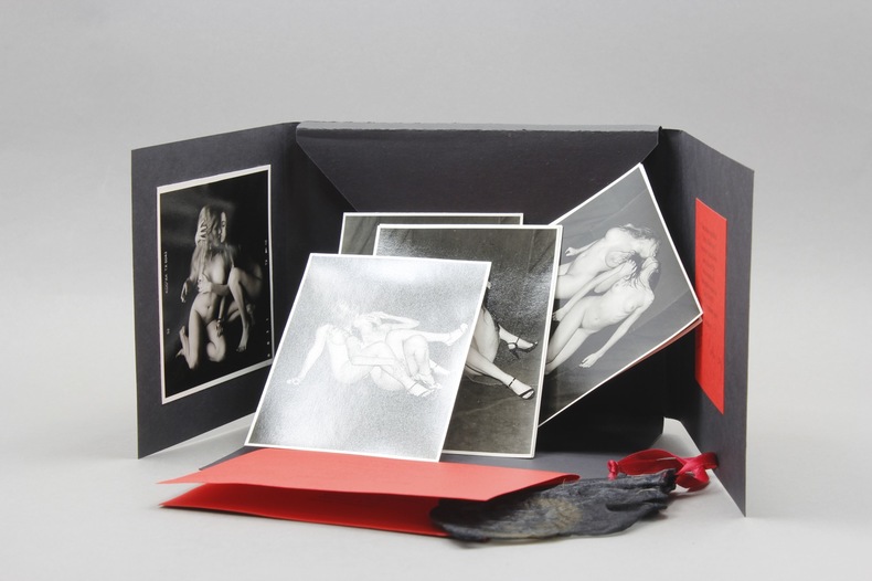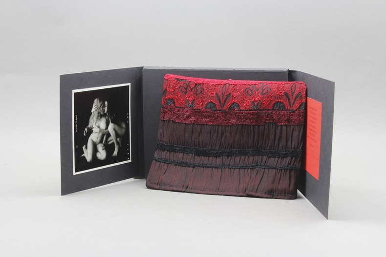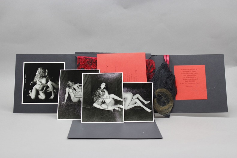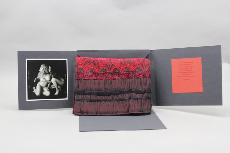 " Non pas un livre, mais un fourreau où sont dévoilées les traces sensuelles de l'amour d'une adolescente pour une autre. A la recherche de cette histoire intense et à jamais perdue, Kathy, jeune photographe sud africaine, exalte sa passion avec impudeur. A l'intérieur d'une bourse en tissu brodé, une mèche de cheveux blonds, 7 photographies érotiques signées, une lettre, le tout présenté dans un étui noir timbré, (14 x 18 cm) et tiré à 21 exemplaires signés " (présentation de l'éditeur).