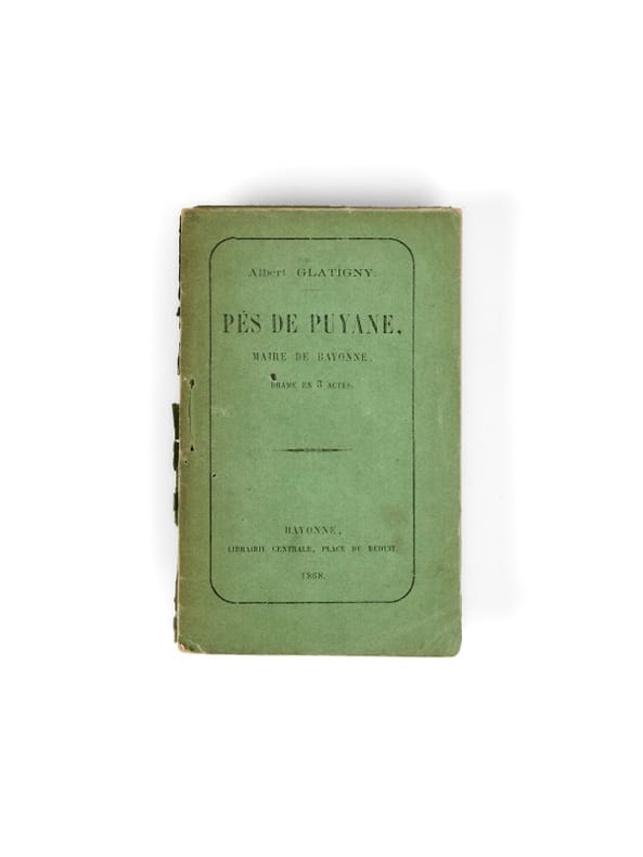 Créée à Bayonne, quelques semaines après sa première pièce, Le Bois, comme celle-ci imprimée à tout petit nombre. « Albert Glatigny, la plus étrange figure littéraire qu'ait peut-être vue notre âge ; un comédien errant et ronsardisant qui a aimé les vers comme on aime l'amour, et qui en est mort.» Aucunes des aventures théâtrales de l'auteur ne sauraient démentir ces lignes, écrites onze ans après sa mort (Paul Bourget, Études et Portraits, 1894). Les difficultés qu'il rencontra pour faire jouer cette pièce en sont encore un bel exemple. Retenu en Corse après une incarcération due à une erreur judiciaire, sans le sou, Glatugny écrit, depuis Sainte-Lucie de Tallano, à son ami Banville : « Montrez à Berton fils mon drame Pés de Puyanne, afin qu'il voit s'il peut l'arranger ou le faire arranger pour n'importe quel théâtre. S'il n'a pas le temps, qu'il le donne à qui il voudra. Si on pouvait me le caser, même à Beaumarchais ! » Le pauvre Glatigny s'avoue « sur la branche », bloqué sur l'île et pressé de rejoindre sa Normandie natale. C'est finalement à Bayonne même que sera représentée la fameuse histoire du maire de la ville. Mais les recettes durent être fort maigres : « La littérature […] a toujours refusé de me nourrir », se plaint-il à un ami quelques mois plus tard. Très fragile couverture avec une légère restauration au premier plat. Rare.
