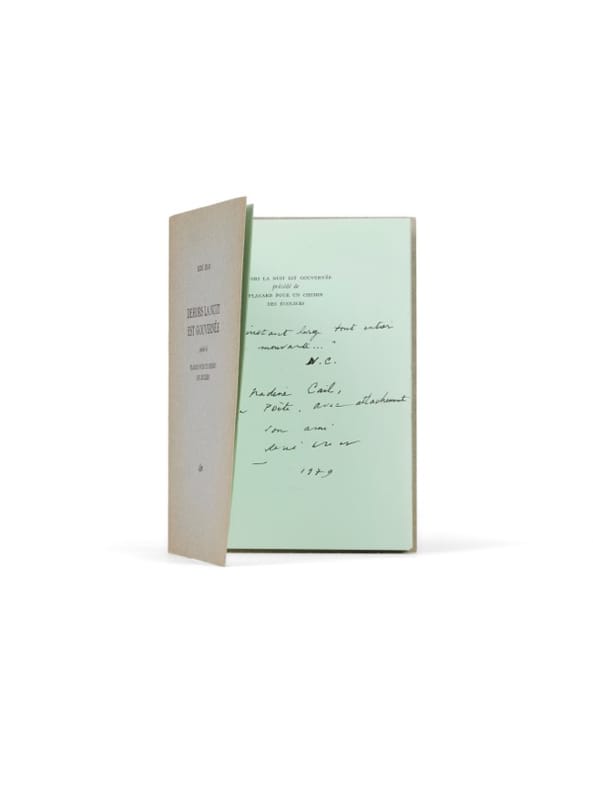 Papier vert de tête et envoi Paris, GLM, (décembre) 1971. 1 vol. (145 x 195 mm) de 75 p., [1] et 1 f. Broché. Nouvelle édition collective, qui reprend la première de 1949. Un des 48 premier exemplaires sur papier vert. Envoi signé : « 'Un instant large tout entier vitre mouvante' R.C. - À Nadine Cail, au poète, avec attachement, son ami. René Char. 1979 ».