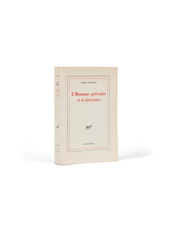 Paris Gallimard 1977 In-8, broché, couverture à rabats, non coupé. 330 pp., [3 ff.]. ÉDITION ORIGINALE. 1/450 exemplaires numérotés sur vélin d'Arches (n° 373). Le dernier livre de Malraux. Le pendant pour la littérature de ce qu'est la Métamorphose des dieux pour les beaux-arts. « Avec L'Homme précaire et la littérature, Malraux acheva plus que son oeuvre, sa vie même. En le lisant, on pense aux dernières oevres des grands musiciens, aux derniers quatuors de Beethoven et de Schubert, aux dernières compositions de Bach ou de Mozart, et tout autant aux Peintures noires de Goya, aux dernières toiles de Rembrandt et de Hals. » (Michaël de Saint-Cheron).