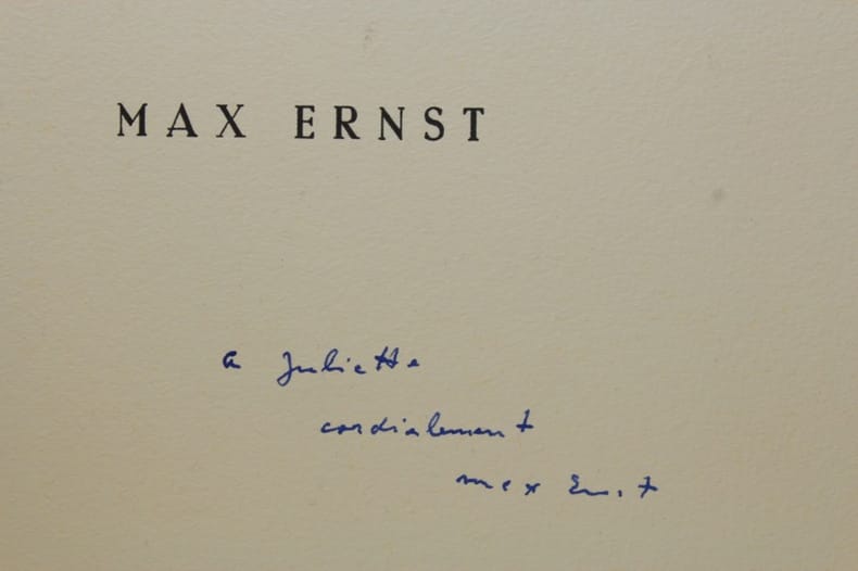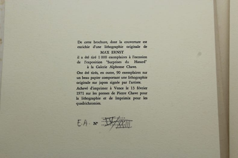 Vence, Galerie Alphonse Chave, 1971. 1 vol. (260 x 210 mm). En feuilles. Édition originale. Un des 32 premiers exemplaires hors commerce, justifié EA, sur vergé fort jaune paille, enrichi d'une lithographie originale sur japon (n° IV), signée par Max Ernst. Envoi signé : « à Juliette [Verronneau], cordialement, Max Ernst »