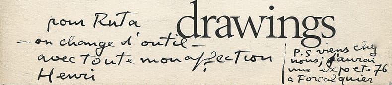 New York, Carlton Gallery, 1975 1 vol. (175 x 255 mm), [8] ff. Broché. Catalogue d'exposition à la Carlton Gallery, février-mars 1975. Introduction de Julien Lévy. 22 dessins reproduits. Envoi signé : "Pour Ruta - on change d'outil - avec toute mon affection Henri. Post-scriptum. Viens chez nous ; j'aurai une expo. 76 à Forcalquier".