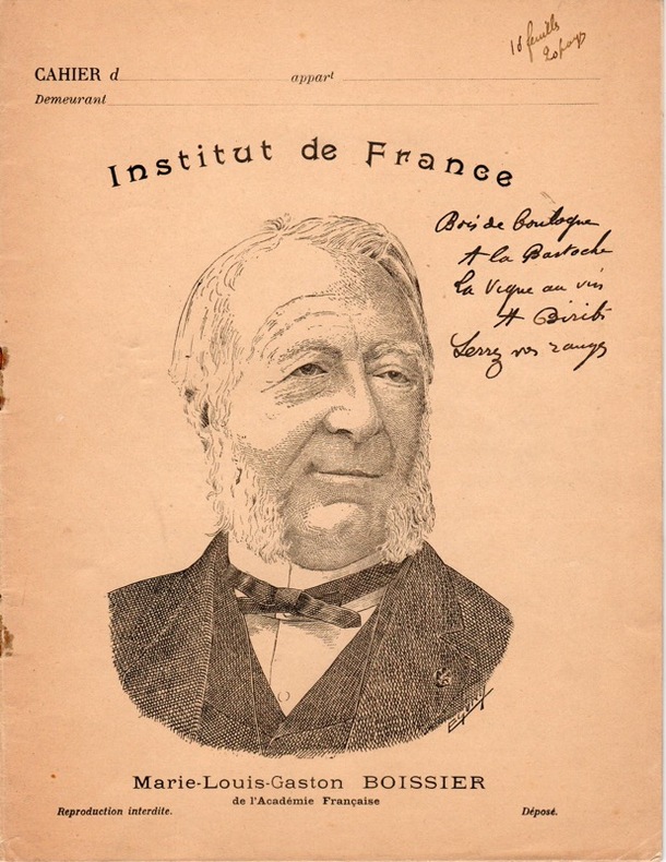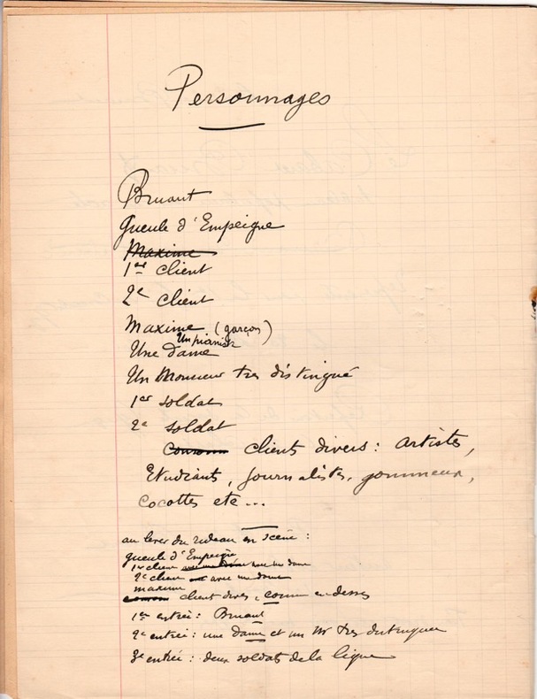 Le 84 boulevard de Rochechouart a une longue histoire montmartroise, dominée par la figure puissante d'Aristide Bruant : c'est là que Rodolphe Salis ouvrit en 1881 dans un ancien bureau de poste un cabaret et c'est à lui que revient de l'avoir baptisé « le Chat noir ». Il trouva en effet, abandonné dans le local désaffecté, un chat efflanqué qu'il adopta et qui lui porta bonheur quand il eut l'inspiration d'engager Aristide Bruant. En 1885 quand le cabaret est transféré 12 rue de Laval (aujourd'hui Victor Massé), Bruant achète le local et le baptise : le Mirliton. C'est le début de la réussite pour celui qui cherchait « fortune à Montmartre le soir » ! La pièce s'ouvre, après les mises en scène de Bruant, par la fameuse Complainte du Chat noir : « Je cherche fortune / Au-autour du Chat Noir / Au-au clair de la lune / A Montma-a-rtre ! / Je cherche fortune / Au-autour du Chat Noir / Au-au clair de la lune / A Montmartre le soir ! » ; suivent ensuite « A la Bastoche » où, « après la chanson on applaudit bruyamment : bravo, bravo » - Bruant, s'adressant au premier client : c'est pas des bravos qu'il faut c'est du pognon ! Suivent de nouveaux dialogues, puis, par Bruant, « La Vigne au Roi », avec le même scénario répété. Les conducteurs des pièces jouées sont rares, et l'on ne connaît que des versions de mises au propre. Précieuse et unique version autographe.