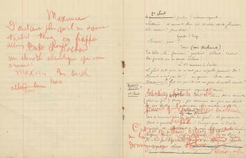Conducteur original d'une représentation au Cabaret Bruant. S.l.n.d. [1903]. 1 cahier d'écolier manuscrit (17,5 x 22,5 cm) de 10 f. (écrits recto-verso) formant le conducteur de la pièce Le Cabaret de BRUANT, avec 5 feuillets autographes de chansons et notes diverses + une carte postale du « Cabaret Bruant », illustré d'un portrait en pied de Bruant, avec cette légende : « tous les clients sont des cochons ! »... Conducteur original d'une représentation au Cabaret Bruant, « Tableau populaire en un acte Représenté pour la première fois le 20 novembre 1903 ». Bruant y liste la distribution sur scène, un plan des lieux et de mise en scène, les dialogues des trois scènes prévues, avec de nombreuses corrections. Il est joint trois billets manuscrits de notes et textes de chants.