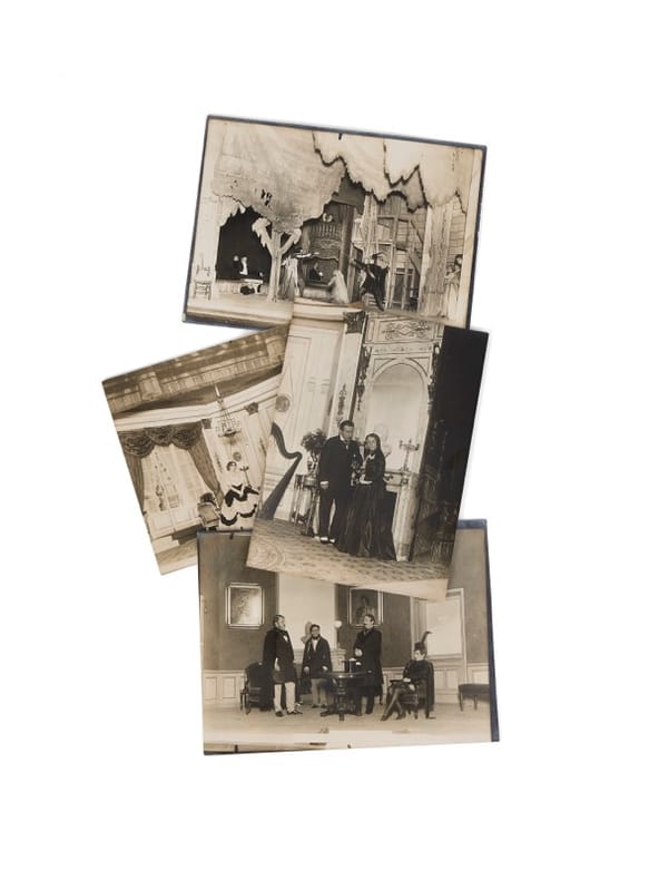 Quatre tirages originaux de Waléry [Paris, 1928]. 4 tirages noir et blanc sur papier argentique (185 x 240 mm), tampon du photographe au dos «Photographie Waléry. 9bis, rue de Londres. Paris». Photographies de scène réalisées par le studio Waléry pour la pièce Mariette ou Comment on écrit l'histoire, avec et Yvonne Printemps et Sacha Guitry dans les rôles-titre. On y voit Yvonne Printemps, vieillie, dans le rôle de la chanteuse Mariette Fleury, et costumée en homme dans celui de Giovanni.