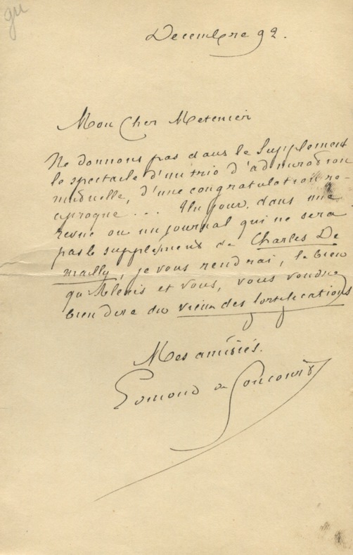 S.l., décembre [18]92. 1 f. (179 x 220) de 13 lignes à l'encre.