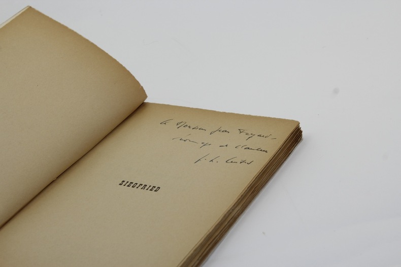 aris, Bernard Grasset, 1928 1 volume in-12 (18,5 x 12,5 cm) de 221-(3) pages. Reliure strictement de l'époque plein maroquin vert sombre doublé de maroquin chamois, dos à quatre nerfs saillants, doublure de maroquin poli sertie d'un filet doré, filets dorés sur les coupes (angles), gardes de moire beige, tête dorée, non rogné, couvertures (une couverture verte et une couverture blanche conservées, les deux plats et le dos, parfaites). Etui bordé de maroquin. Reliure signée Jean Duval (1894-1964). Le dos de la reliure et les bords de l'étui ont foncé. Quelques rousseurs, la plupart sur les tranches. Deux petites traces de choc sur l'étui (sans gravité). Superbe ensemble. Édition originale. Tirage de tête à 62 exemplaires sur Madagascar (n°4). Deuxième Cahier Vert de la troisième série. D'abord un roman, Siegfried et le Limousin (publié en 1922 chez le même éditeur), de Jean Giraudoux, ce dernier décida de l'adapter au théâtre en concentrant l'intrigue et fit ainsi son entrée triomphale dans le Gotha des jeunes auteurs au succès fulgurant. La première pièce de Giraudoux fut créée par Louis Jouvet, le 3 mai 1928. Inspirée très librement du roman Siegfried et le Limousin, elle raconte en quatre actes comment un allemand célèbre - qui a perdu la mémoire à la guerre - retrouve sa véritable identité de Français, sous la pression de son ennemi politique et grâce aux interventions subtiles de son ancienne maîtresse. Sur ce canevas, Giraudoux peignait de l’Allemagne un tableau contrasté, entre la séduction du romantisme et la menace d’un nationalisme revanchard. Incarnant un idéal pacifiste, cette pièce d’une écriture nouvelle connut un énorme succès et détermina le passage de Giraudoux à la scène et sa coopération viscérale avec Louis Jouvet. « J’avais appris que l’auteur de Siegfried et le Limousin songeait à son roman pour la scène. À vrai dire, lorsque je le rencontrai pour la première fois il avait déjà écrit une pièce qui aurait duré huit heures » (Louis Jouvet, L ’Ordre, 16 mai 1938). Giraudoux accepta de bon cœur de retravailler sa pièce, en tenant compte des remarques, des coupures, des propositions de son metteur en scène, et le 3 mai 1928, le rideau de la Comédie des Champs-Élysées se levait sur l’histoire du soldat Siegfried. Blessé au champ de bataille, frappé d’amnésie, il avait été soigné et rééduqué en Allemagne, pour devenir, dans ce pays, un personnage de premier plan. En réalité, Siegfried était un écrivain français que reconnut Geneviève, sa fiancée du Limousin. Mis devant le fait accomplir, il dût se rendre à l’évidence. Évènement théâtral de la saison 1927-1928, la première représentation de Siegfried réunit le Tout-Paris. Le souvenir de la Grande Guerre était encore présent dans les cœurs et le public se passionna. La critique fut souvent plus qu’élogieuse mais parfois indignée. Certains louèrent « l’humour attendri et le lyrisme familier » « le diagnostique précis » de l’auteur. Mais, tandis que le critique du Petit Journal se félicitait que « l’œuvre (soit) essentiellement pacifique », René Doumic de l’Académie Française s’insurgeait : « C’est le cœur serré, dans un profond sentiment de tristesse et d’humiliation, que j’ai assisté à la pièce de M .Giraudoux Siegfried, une pièce allemande par un auteur français, une pièce à l’honneur de l’Allemagne ». En dépit de ce méchant article, le spectacle connut une très jolie carrière. Il atteint la 300 ème représentation avant de partir en tournée à travers la France. Le Duo Giraudoux-Jouvet poursuivit son travail de mise en scène avec Amphitryon 38 (comédie en 3 actes), Judith, Intermezzo, etc. Les reliures signées Jean Duval sont réputées pour leur finesse d'exécution. Issu d'une grande famille de relieurs parisiens établis après la guerre de 1870. Jean Duval succéda à son père en 1921. Il exerça jusqu'à sa mort en 1964. Ancien élève de l'école Estienne, on lui doit la formation de nombreux relieurs, dont Pierre-Lucien Martin. Très bel exemplaire en maroquin doublé de Jean Duval.